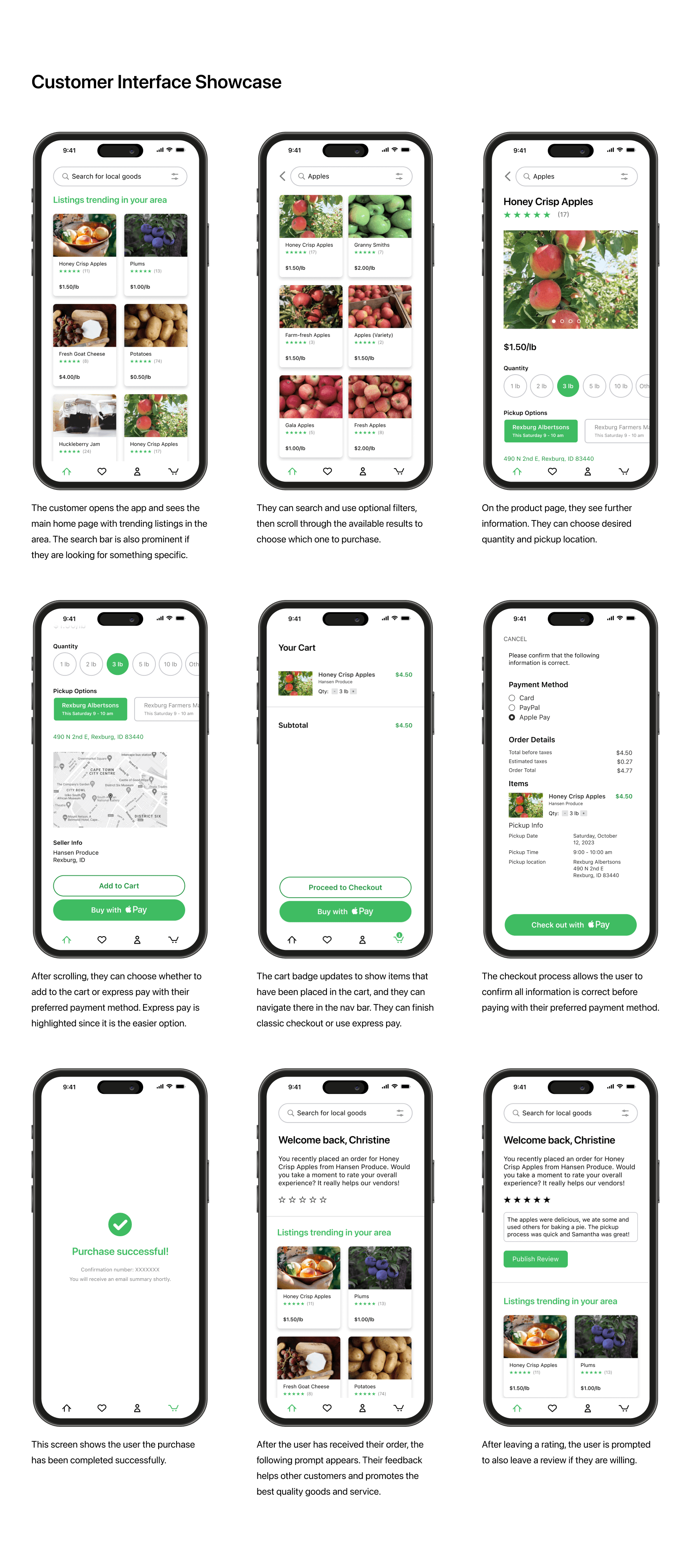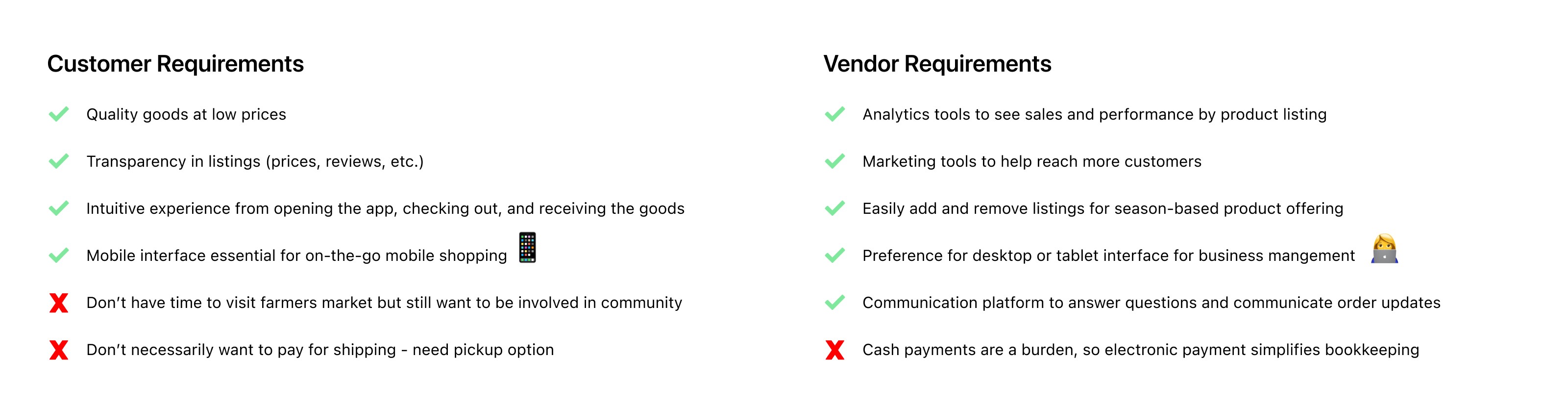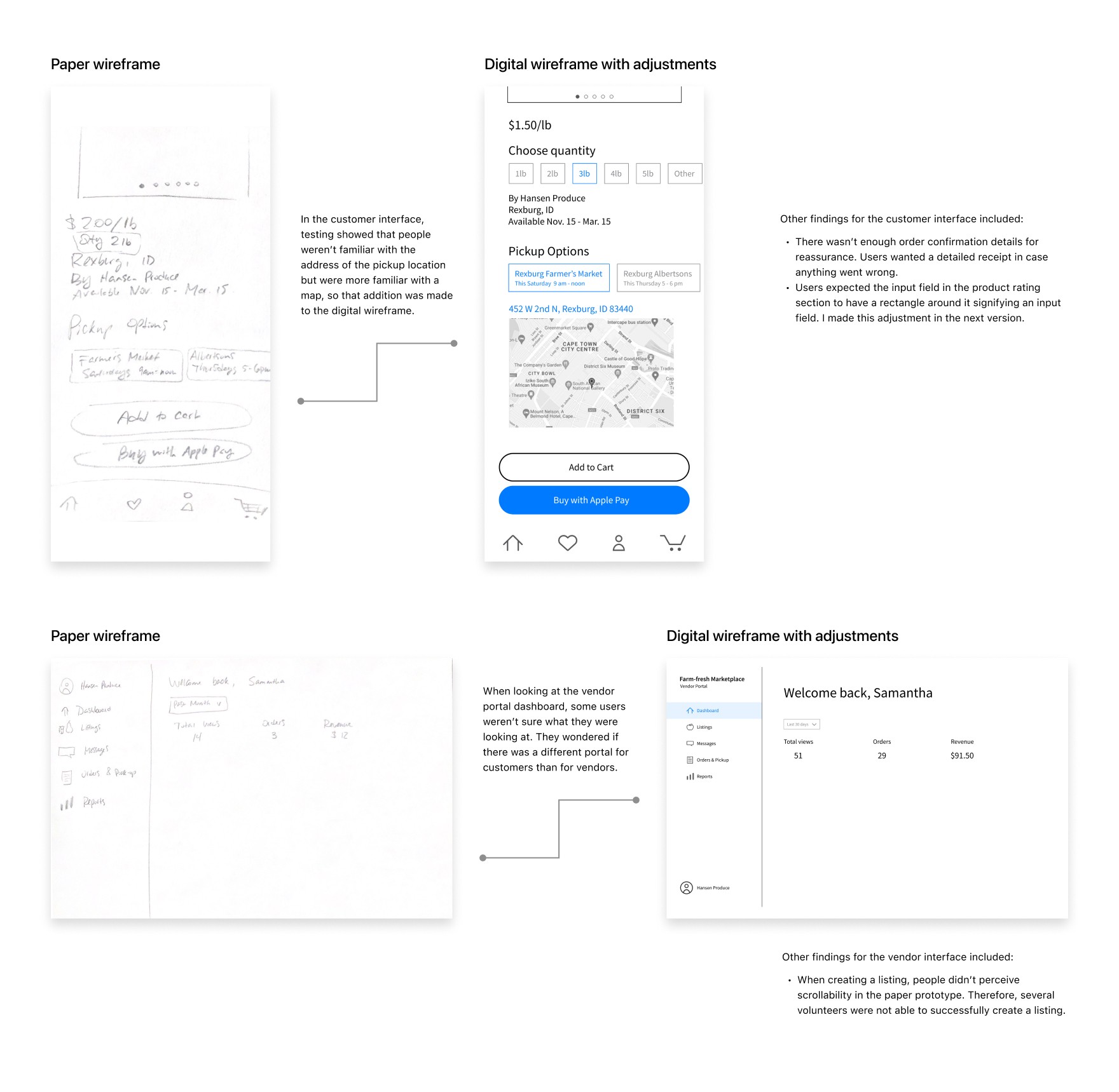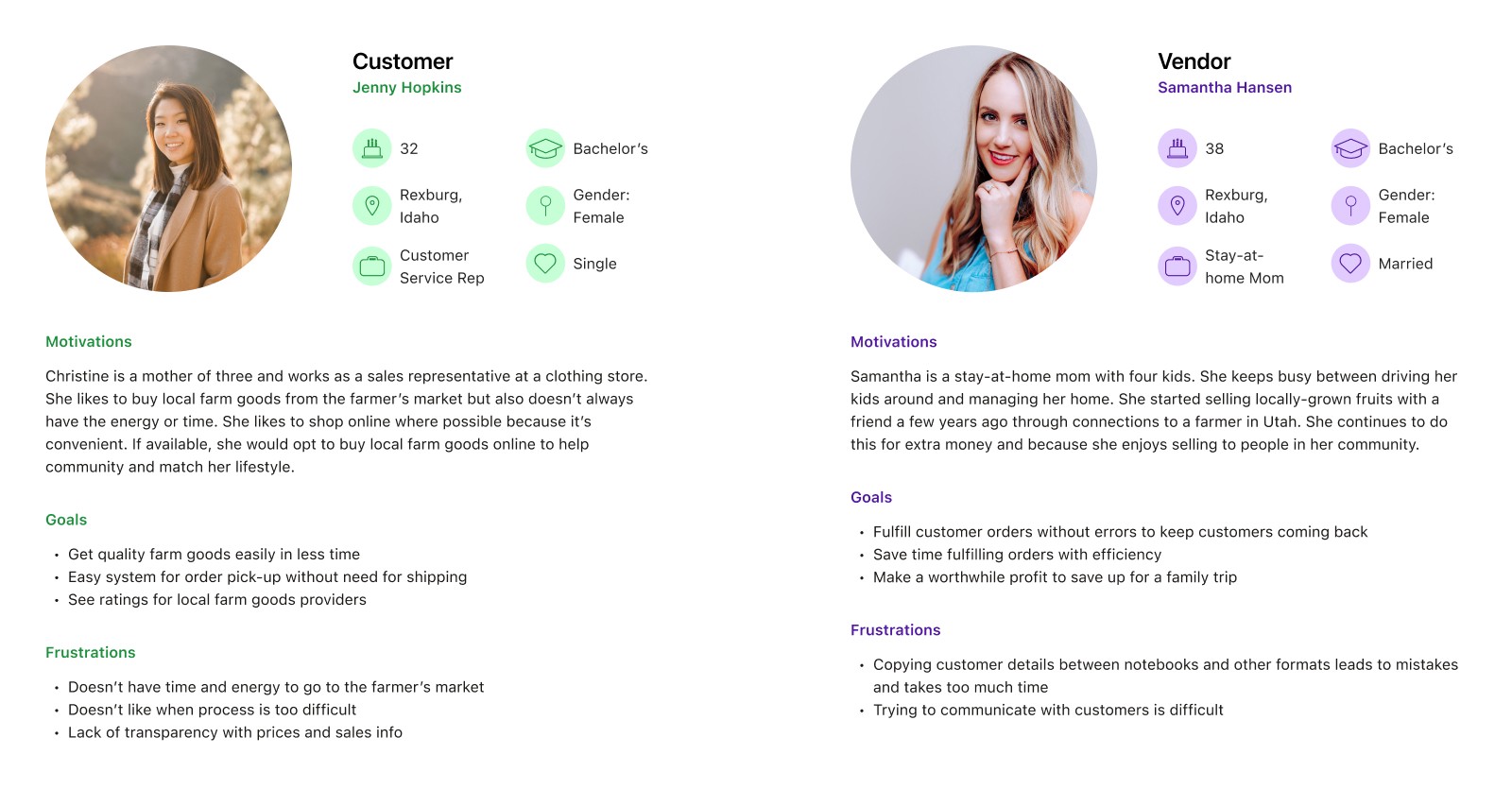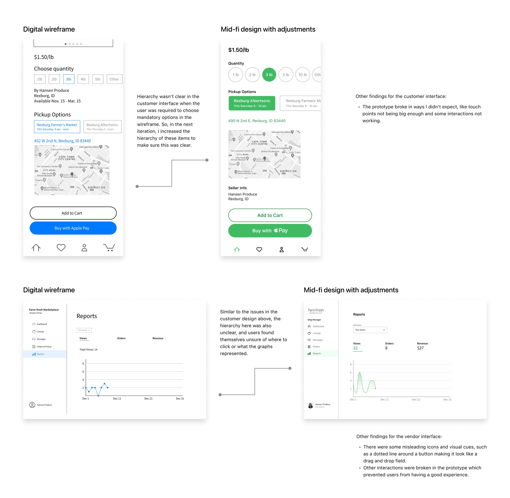 I began by conducting six interviews to understand both business owner and customer needs. I reached out to Rachel again to ask her about opportunities to solve pain points in her business. I also interviewed a couple other businesses selling perishable goods and people who fit the profile of local farm goods customers.