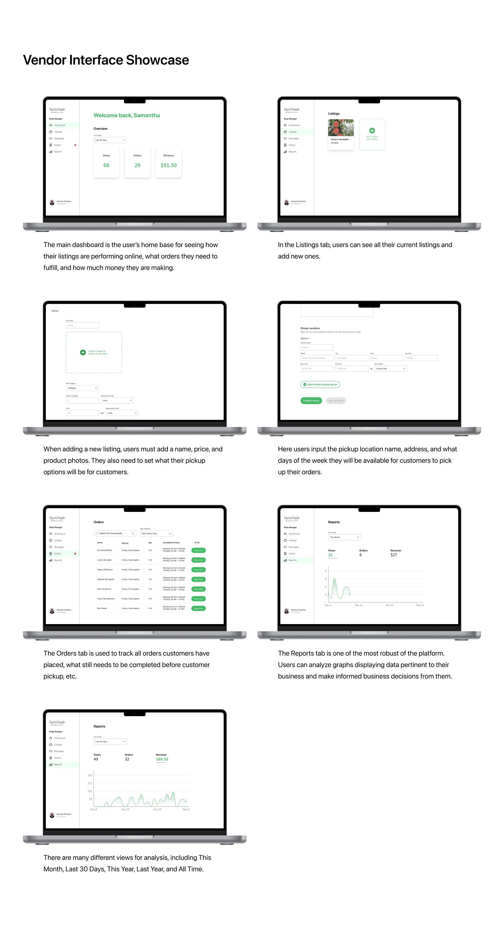 People want to buy local farm goods, but they don't have time to go to the farmers market. Introducing FarmFresh Marketplace, a tool that helps people easily purchase quality goods within their local community.