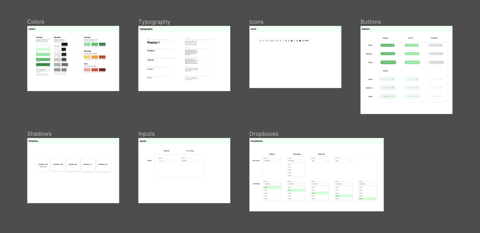 At this stage, I began refining the UI with a custom-built mini design system complete with color, typography, icons, buttons, shadows, inputs, and dropdown boxes. Of course, this barely scratches the surface of what design systems can include, but it was great practice to put it together on my own.